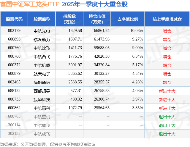 根据2025基金Q1季报公募基金重仓股数据,重仓该股的公募基金共25家,其中持有数量最多的公募基金为富国基金的富国中证军工龙头ETF。富国中证军工龙头ETF目前规模为66.32亿元,最新净值0.6151(5月20日),较上一交易日下跌0.73%,近一年上涨8.64%。该公募基金现任基金经理为王乐乐 牛志冬。王乐乐在任的基金产品包括:富国央企创新ETF,管理时间为2019年9月20日至今,期间收益率为58.6%;富国中证消费50ETF,管理时间为2019年10月14日至今,期间收益率为18.36%;富国中证科技50策略ETF,管理时间为2019年11月15日至今,期间收益率为32.24%。牛志冬在任的基金产品包括:富国中证移动互联网指数(LOF)A,管理时间为2015年5月13日至今,期间收益率为-33.79%;富国中证医药主题指数增强A,管理时间为2016年11月11日至今,期间收益率为27.55%;富国中证娱乐主题指数增强(LOF)A,管理时间为2017年3月13日至今,期间收益率为-31.83%;