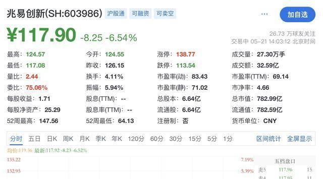 瑞财经 吴文婷5月21日,兆易创新股价下跌。截至发稿时,其报117.9元,跌6.54%,总市值约782.99亿元。