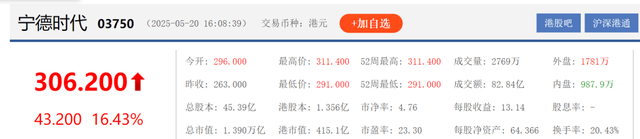 5月20日收盘,宁德时代港股股价飙升至306.2港元,涨幅16.43%,港股股价甚至高于A股股价,港股市值1.39万亿港元,也高于A股市值,“宁王”在港股一炮走红。受益于宁王在资本市场的优异表现,港交所IPO募资金额重回全球第一。