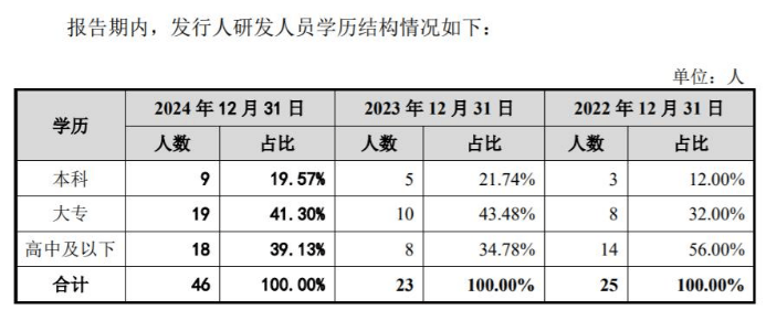不仅如此,酉立智能在研发投入上的不足还表现在研发人员人数及研发人员学历方面。2024年末,酉立智能的研发人员为46人。这一人数在五家可比公司中是最低的。五家可比公司中,研发人数最少的是清源股份,其研发人数也有70人,比酉立智能也多了24人。