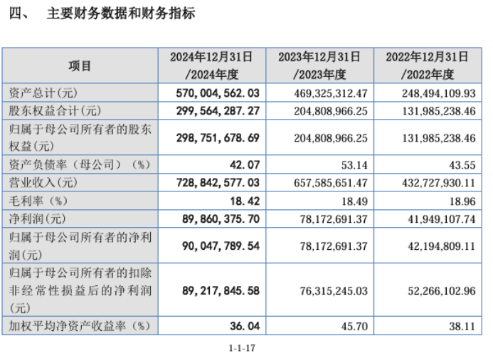 该公司的招股说明书显示,从2021年到2024年,其营业收入分别为3.84亿元、4.33亿元、6.58亿元、7.29亿元,其净利润分别为1477.68万元、4194.91万元、7817.27万元、8986.04万元。不论是营收还是净利润都呈现出稳步增长的势头。其中,2024年营业收入较2021年增长89.84%;净利润更是增长508.12%。如此亮丽的业绩难免令人心动,因此打动北交所上市委的审核人员并不令人奇怪。