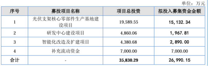 而在今年5月9日发布的招股书上会稿中,募资计划缩减到2.7亿元。其中,光伏支架核心零部件生产基地建设项目拟募资规模由1.96亿元调减至1.51亿元;研发中心建设项目拟募资规模由4860.06万元调减至1967.81万元;智能化改造及扩建项目拟募资规模由4380.68万元缩减至2890万元。募资计划如此随意缩减,公司募资计划的真实性自然令人质疑。