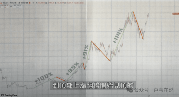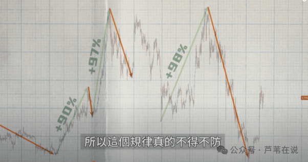 像比特币这轮周期是从1万5涨到3万见顶开始回调,然后再从两万五翻倍到4万9后开始大幅回撤,接着又从3万8翻倍到了7万4,以及去年5万底部涨到去年12月的10万见顶,非常神奇,基本每次涨幅都是从底部到顶部上涨翻倍开始见顶的。