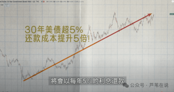 与此同时,美债最近有点蹦了,三十年期美债时隔两年又飞到了5%以上,这意味着美的新债将会以每年5%的利息还款,5年来成本飙升了5倍。