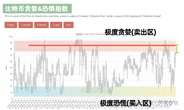好了,我们继续,如果用历史数据回测,用咱们上次分析的比特币贪婪与恐惧指数来看,比特币是平均会在贪婪达到85附近见顶,而现在比特币是75,所以理论上来看,比特币这波涨幅的顶部是会在11.5万到12万左右。