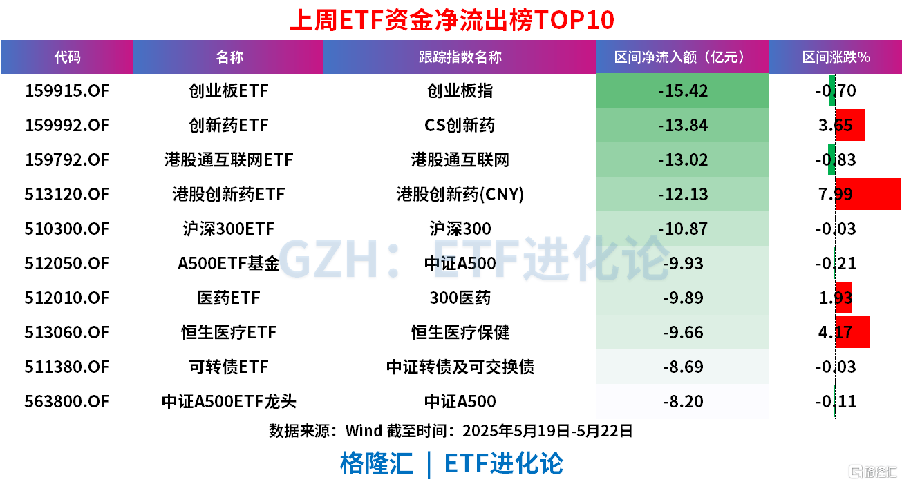 创业板ETF、创新药ETF、港股通互联网ETF和港股创新药ETF上周分别净流出15.42亿元、13.84亿元13.02 和12.13亿元。