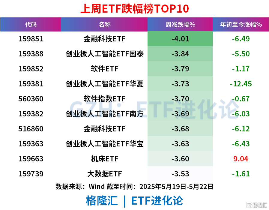金融科技ETF、创业板人工智能ETF国泰、软件ETF、创业板人工智能ETF华夏上周分别跌4.01% 、3.84 %3.79 %和3.73%。