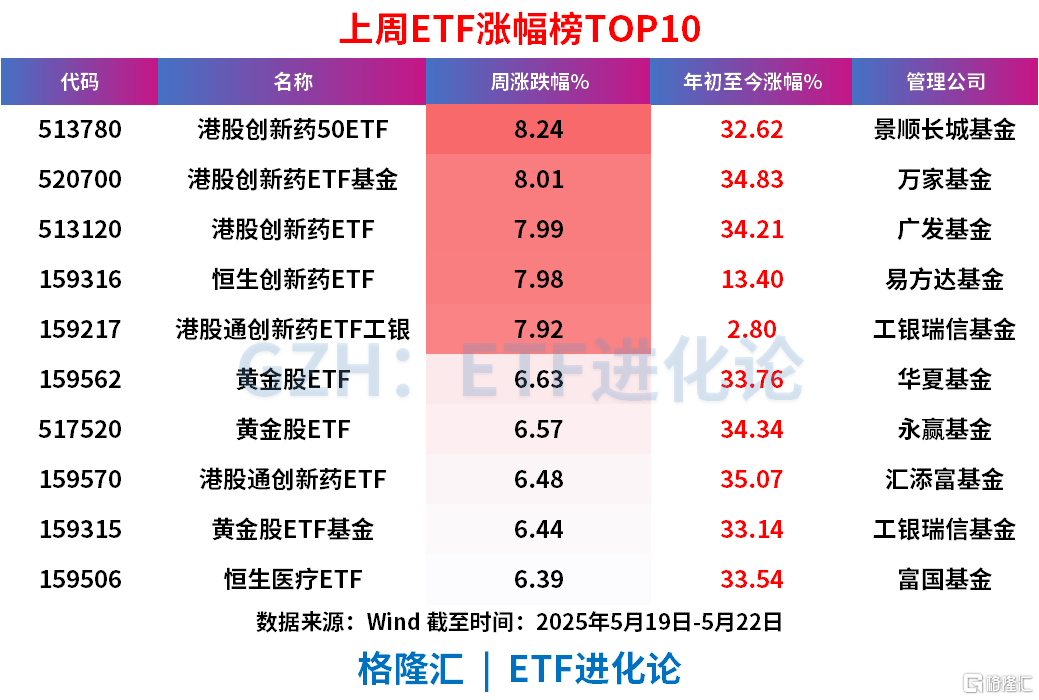 景顺长城基金港股创新药50ETF、万家基金港股创新药ETF基金、广发基金港股创新药ETF、易方达基金恒生创新药ETF上周分别涨8.24%、8.01% 、7.99%和7.98%。