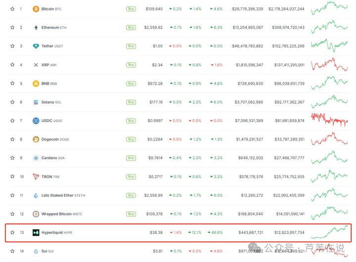 一个惊人的信号:HYPE市值超越 SUI,位列市值第13