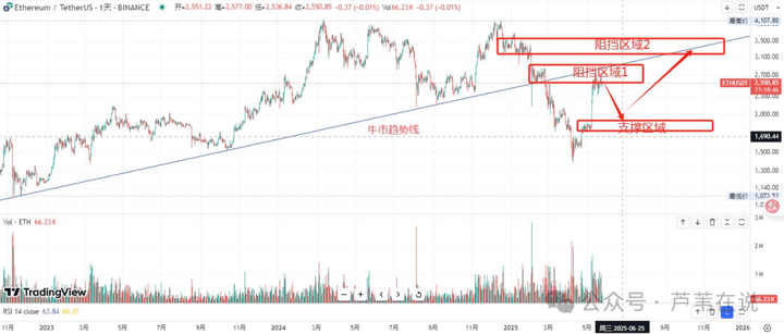 以太坊现已反弹至牛市趋势线附近,我认为它可能会先回调测试支撑区,随后再次上涨并测试趋势线,但最终可能在3100-3500的阻挡区域2遭遇压制。总之,我认为以太坊的这波行情主要是一次较大的反弹。