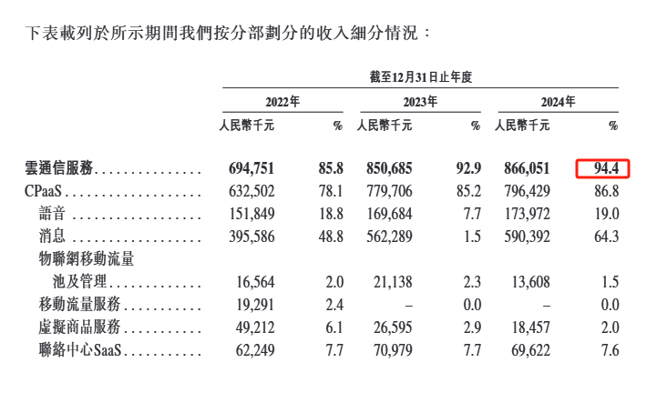 讯众股份收入主要来自于云通信服务,2024年收入占比达到94.4%。公开资料显示,公司的云通信服务是一系列增值通信服务,主要通过应用程序接口在线上向客户提供消息、语音及移动流量通信。