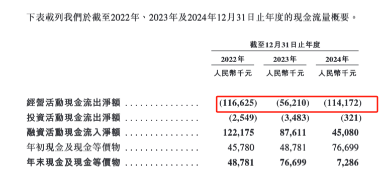 2022年至2024年,讯众股份经营活动现金流出净额分别为1.17亿元、0.56亿元、1.14亿元。公司表示经营活动现金流出主要是由于贸易应收款项增加、贸易应收款项周转期延长,以及预付款、其他应收款项和其他资产增加。