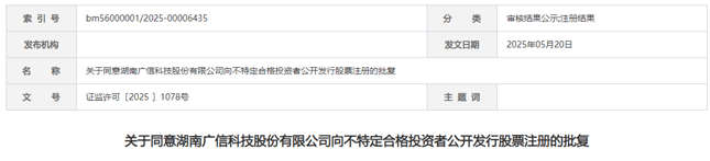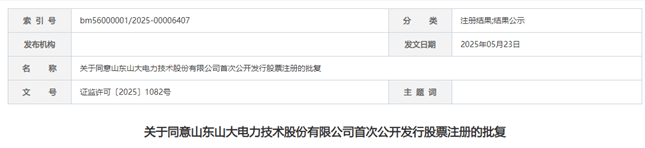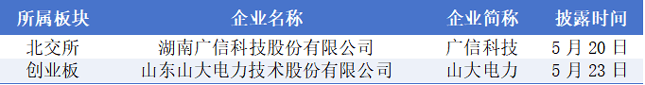 5月19日至5月25日期间,证监会披露了2家拿到注册批文企业的情况,为湖南广信科技股份有限公司、山东山大电力技术股份有限公司。