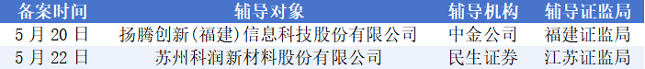 5月19日至5月25日期间新增辅导备案企业2家,分别为扬腾创新(福建)信息科技股份有限公司、苏州科润新材料股份有限公司。