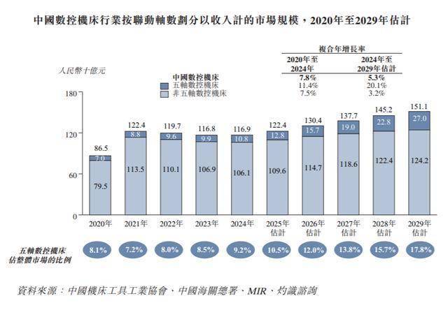 作为全球制造业大国,中国庞大的制造需求为数控机床创造了大量市场机遇。按收入计,中国数控机床行业的市场规模由2020年的人民币865亿元增至2024年的人民币1,169亿元,预计将以复合年增长率5.3%稳步上升至2029年的人民币1,511亿元。五轴数控机床以五轴联动为特征,凭借三个直线轴与两个旋转轴的协同动作,能够高速且高精度地加工具有复杂特征或表面的零件。五轴数控机床亦具备智能化、复合加工与高性能网络通讯功能,被定位为数控机床分类中的高端装备。