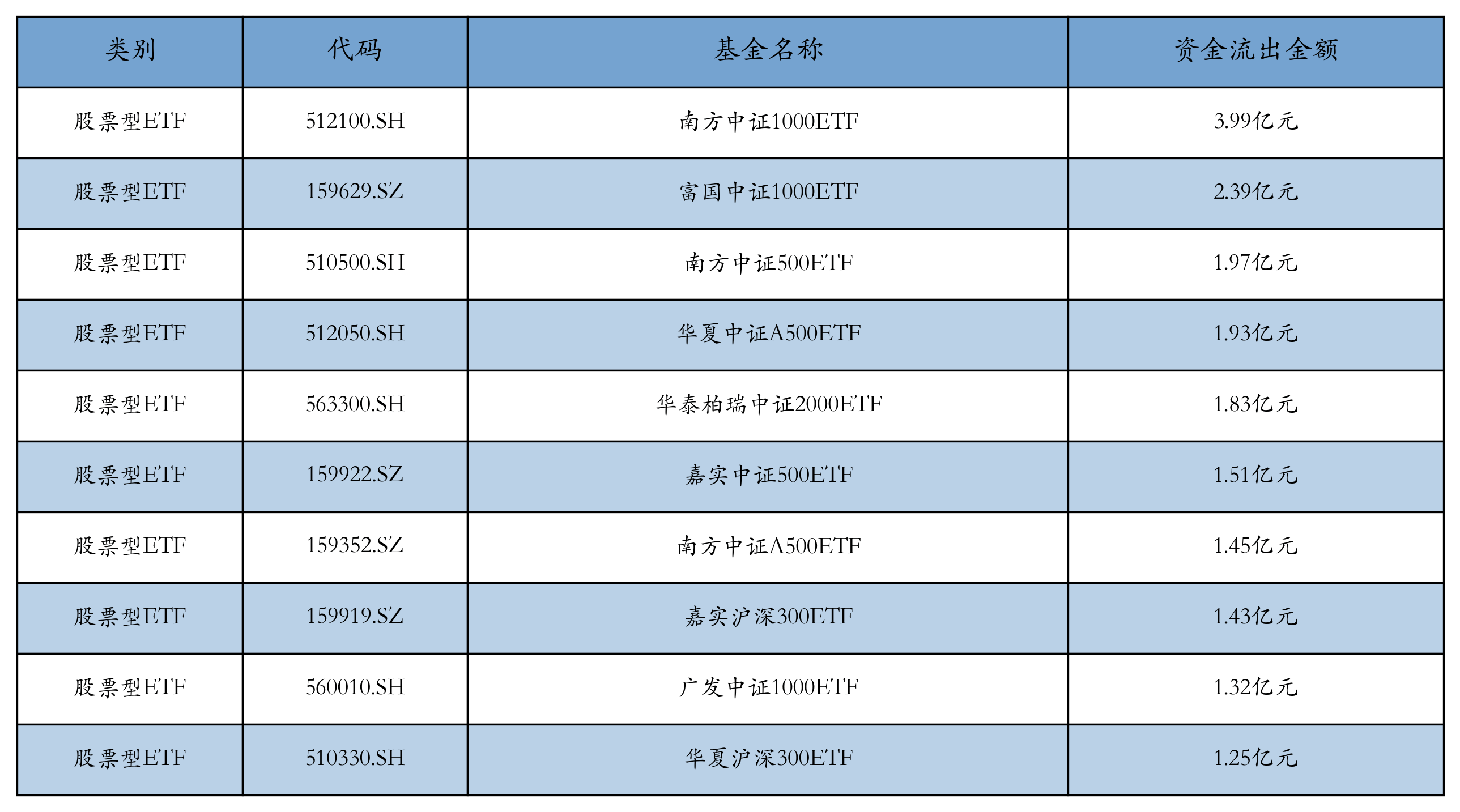 昨日股票型ETF资金流出最多的3支ETF及其流出金额分别为:南方中证1000ETF(流出3.99亿元)、富国中证1000ETF(流出2.39亿元)、南方中证500ETF(流出1.97亿元)。资金流出前10详情见下表: