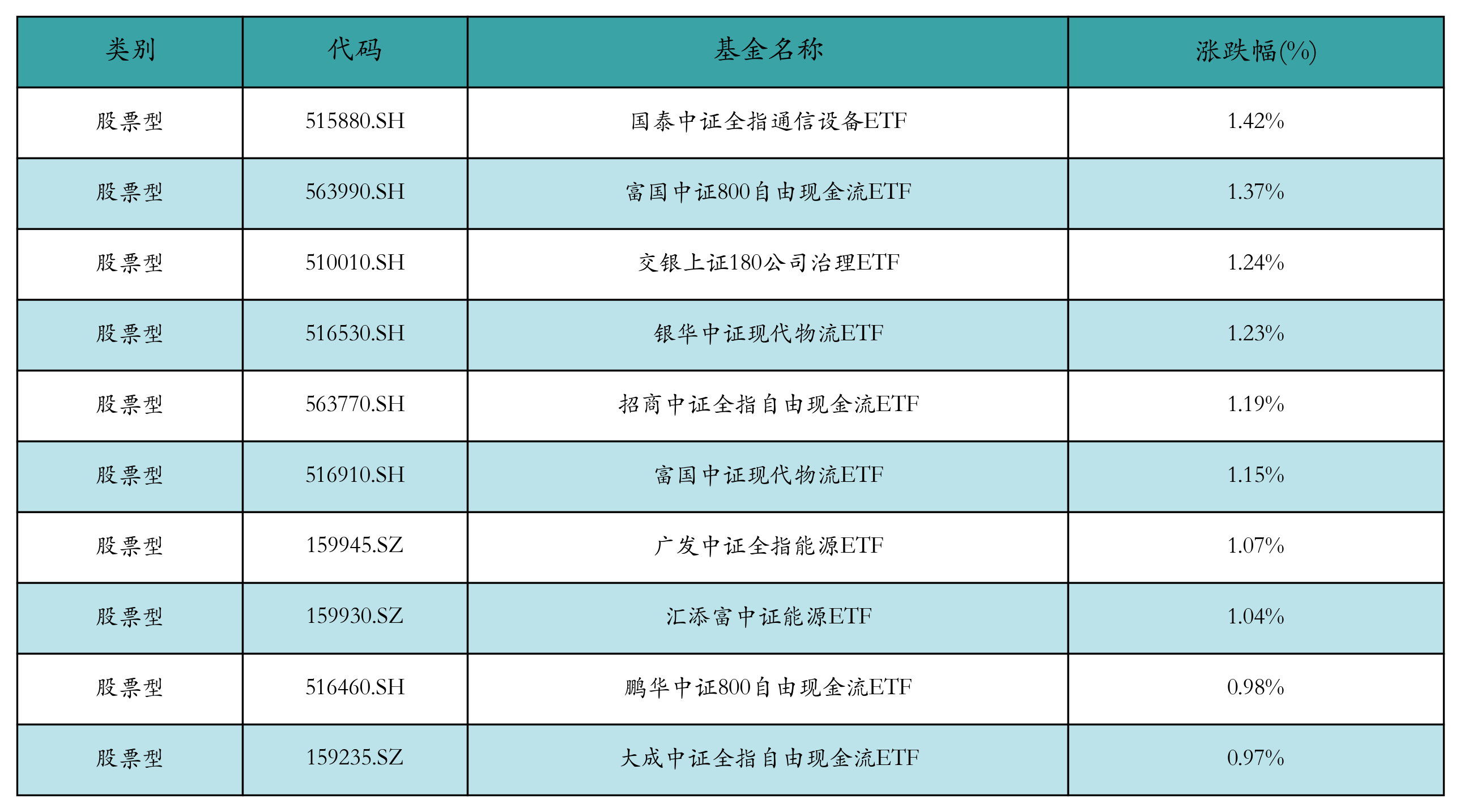昨日股票型ETF涨幅最高的3支ETF及其收益率分别为:国泰中证全指通信设备ETF(1.42%)、富国中证800自由现金流ETF(1.37%)、交银上证180公司治理ETF(1.24%)。涨幅前10详情见下表:
