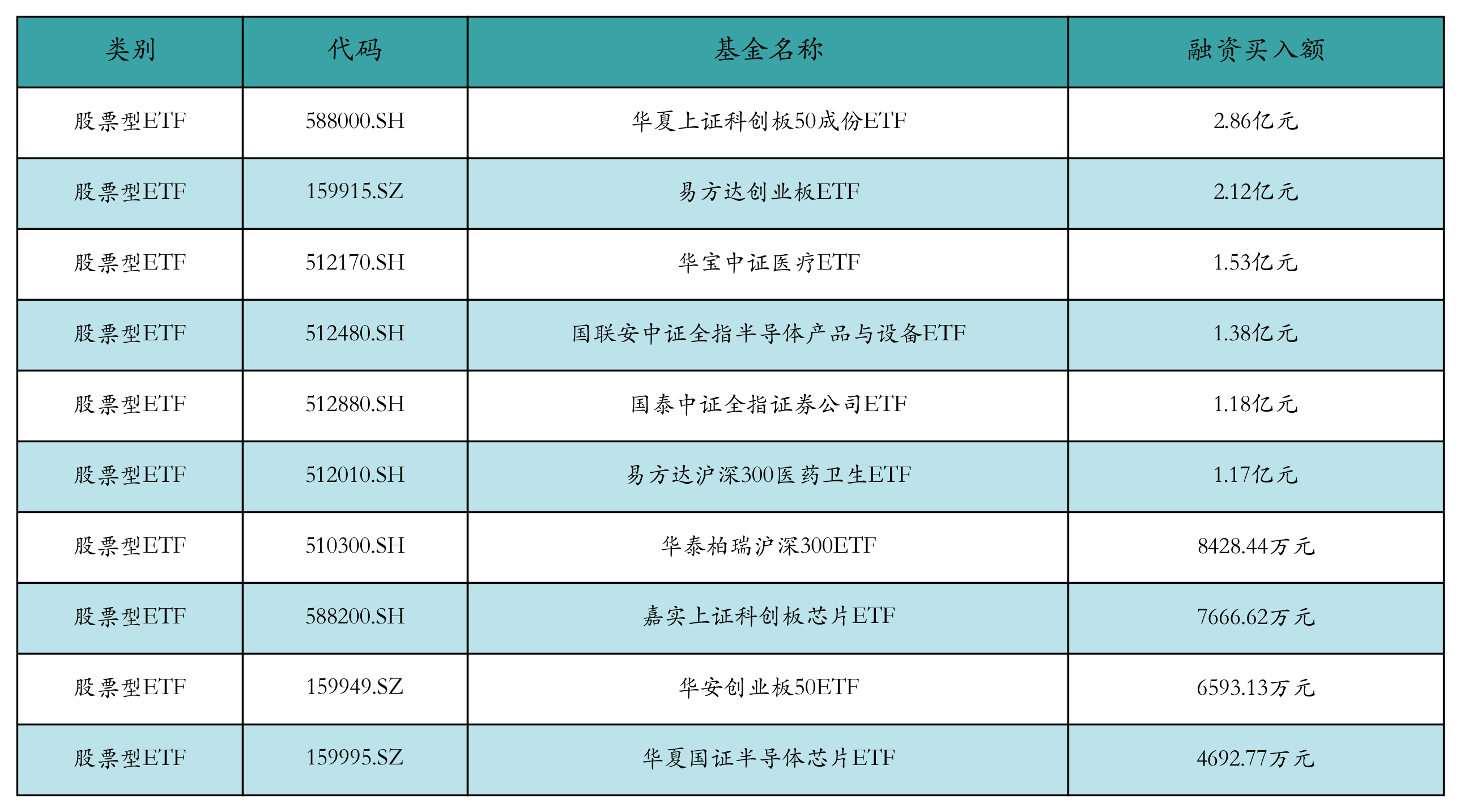昨日股票型ETF融资买入额最高的3支ETF及其买入金额分别为:华夏上证科创板50成份ETF(2.86亿元)、易方达创业板ETF(2.12亿元)、华宝中证医疗ETF(1.53亿元)。融资买入额前10详情见下表: