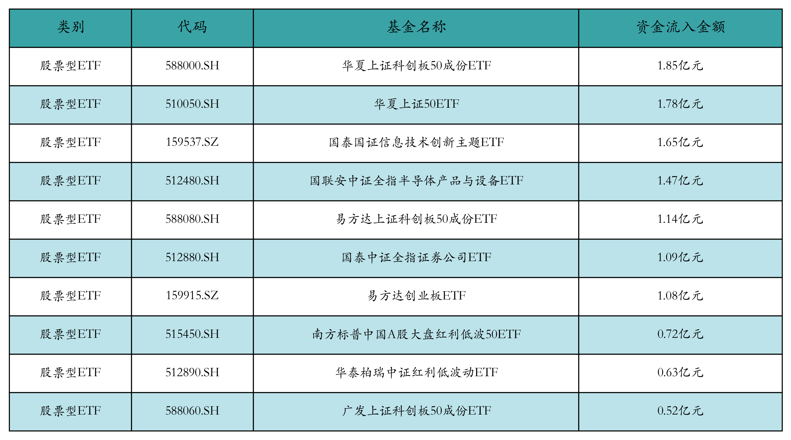 昨日股票型ETF资金流入最多的3支ETF及其流入金额分别为:华夏上证科创板50成份ETF(流入1.85亿元)、华夏上证50ETF(流入1.78亿元)、国泰国证信息技术创新主题ETF(流入1.65亿元)。资金流入前10详情见下表: