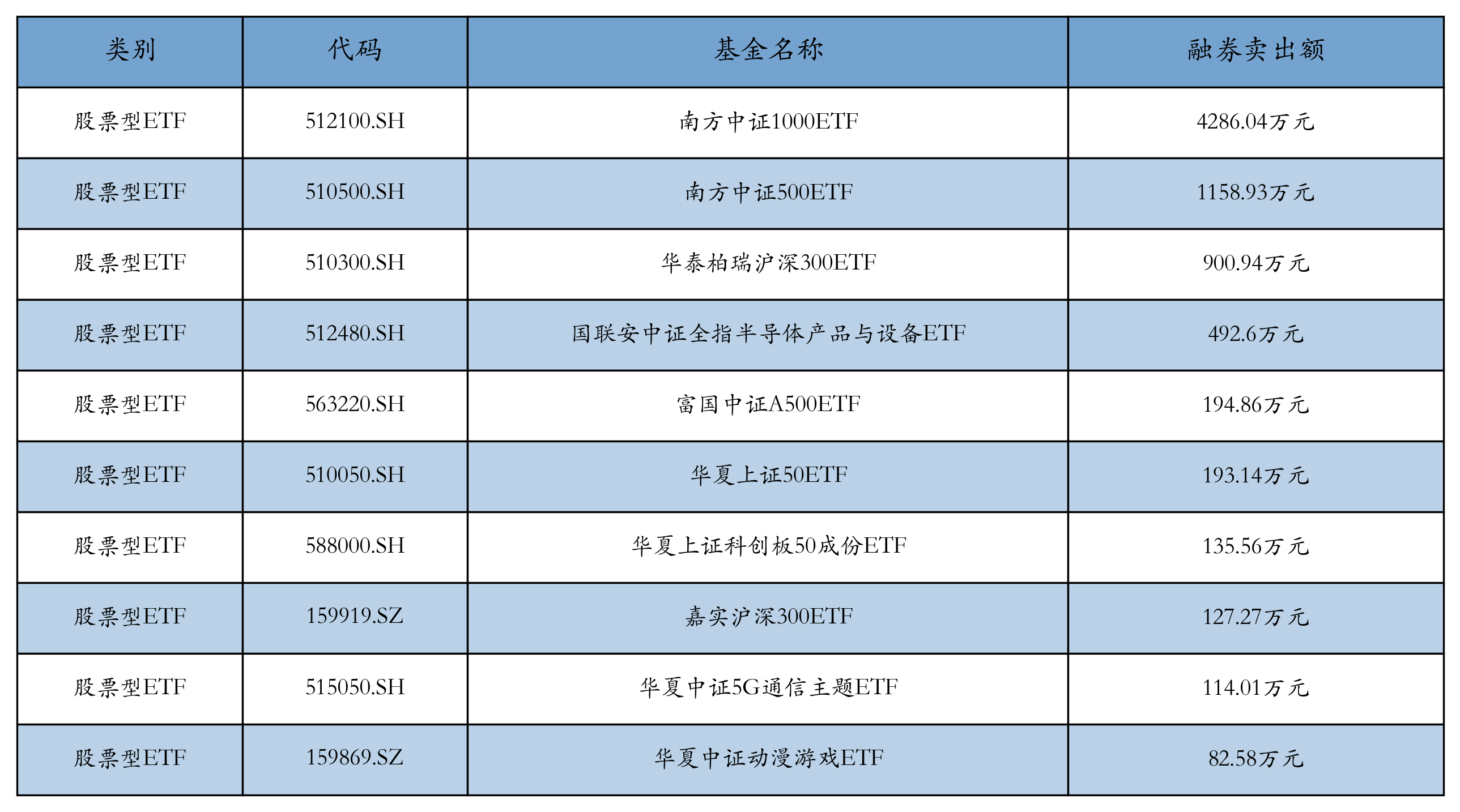 昨日股票型ETF融资卖出额最高的3支ETF及其卖出金额分别为:南方中证1000ETF(4286.04万元)、南方中证500ETF(1158.93万元)、华泰柏瑞沪深300ETF(900.94万元)。融券卖出额前10详情见下表: