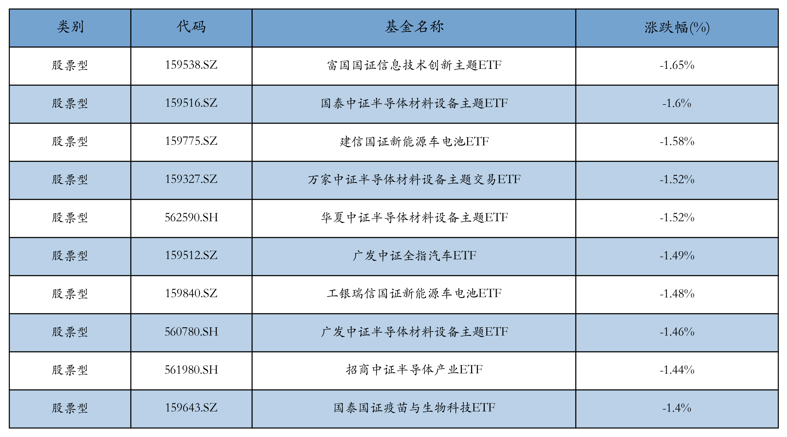 昨日股票型ETF跌幅最大的3支ETF及其收益率分别为:富国国证信息技术创新主题ETF(-1.65%)、国泰中证半导体材料设备主题ETF(-1.6%)、建信国证新能源车电池ETF(-1.58%)。跌幅前10详情见下表: