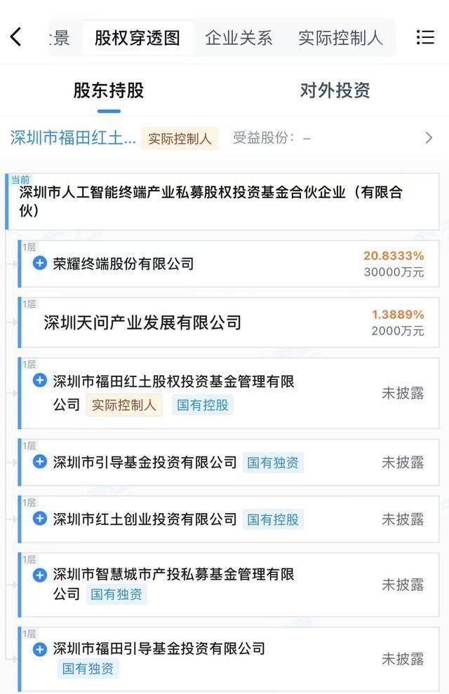 据查阅,该基金的出资规模为14.4亿元,经营范围包括股权投资、投资管理、资产管理等。天眼查穿透股权显示,该基金由荣耀终端股份有限公司、深圳市引导基金、深圳市福田引导基金、深圳市红土创业投资有限公司等共同出资。