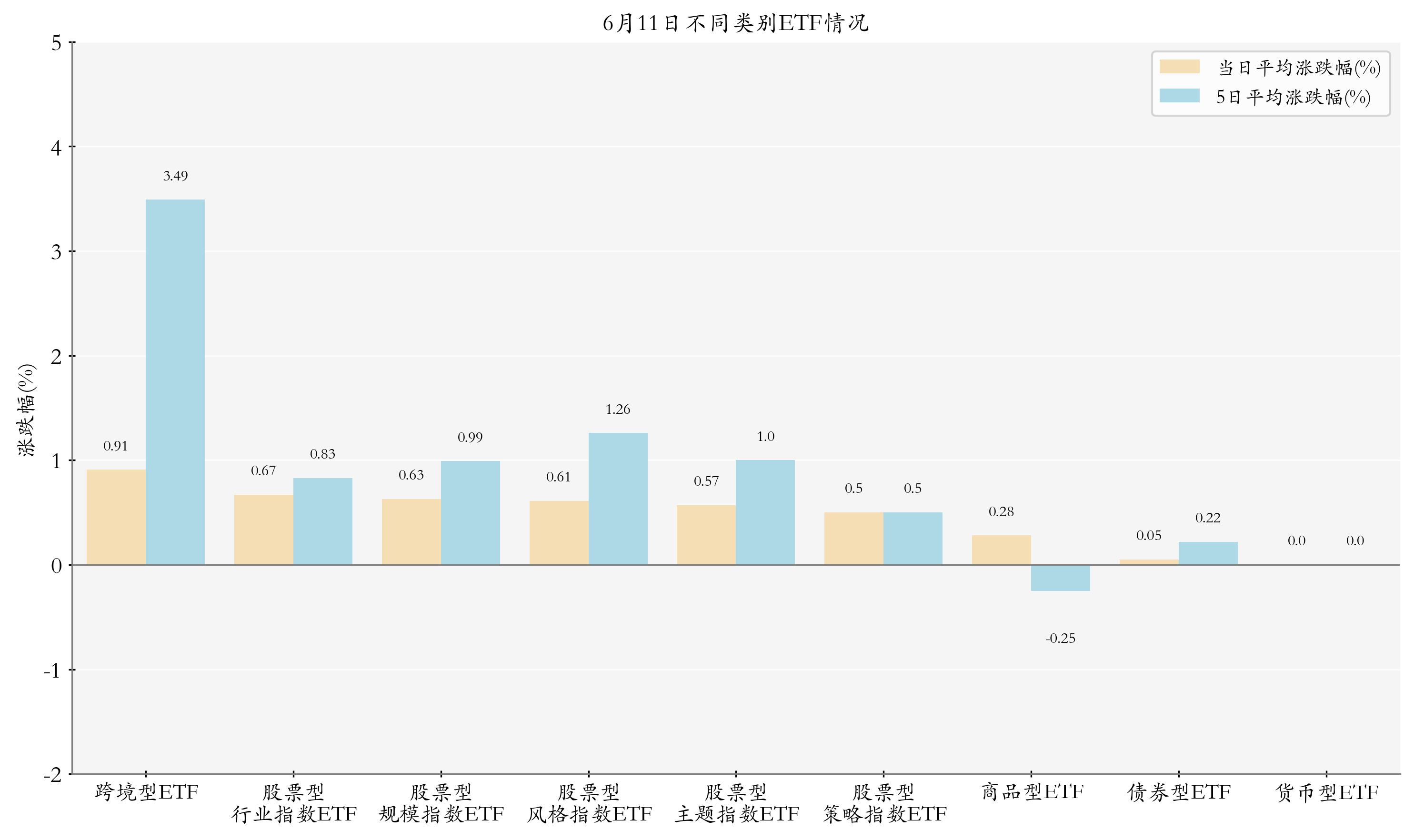 根据ETF基金的投资范围,将ETF基金划分为股票型规模指数ETF、股票型行业指数ETF、股票型策略指数ETF、股票型风格指数ETF、股票型主题指数ETF、债券型ETF、商品型ETF、货币型ETF、跨境ETF,今日跨境型ETF表现最优,该类ETF的平均涨跌幅为0.91%;货币型ETF的表现最差,该类ETF的平均涨跌幅为0.00%。