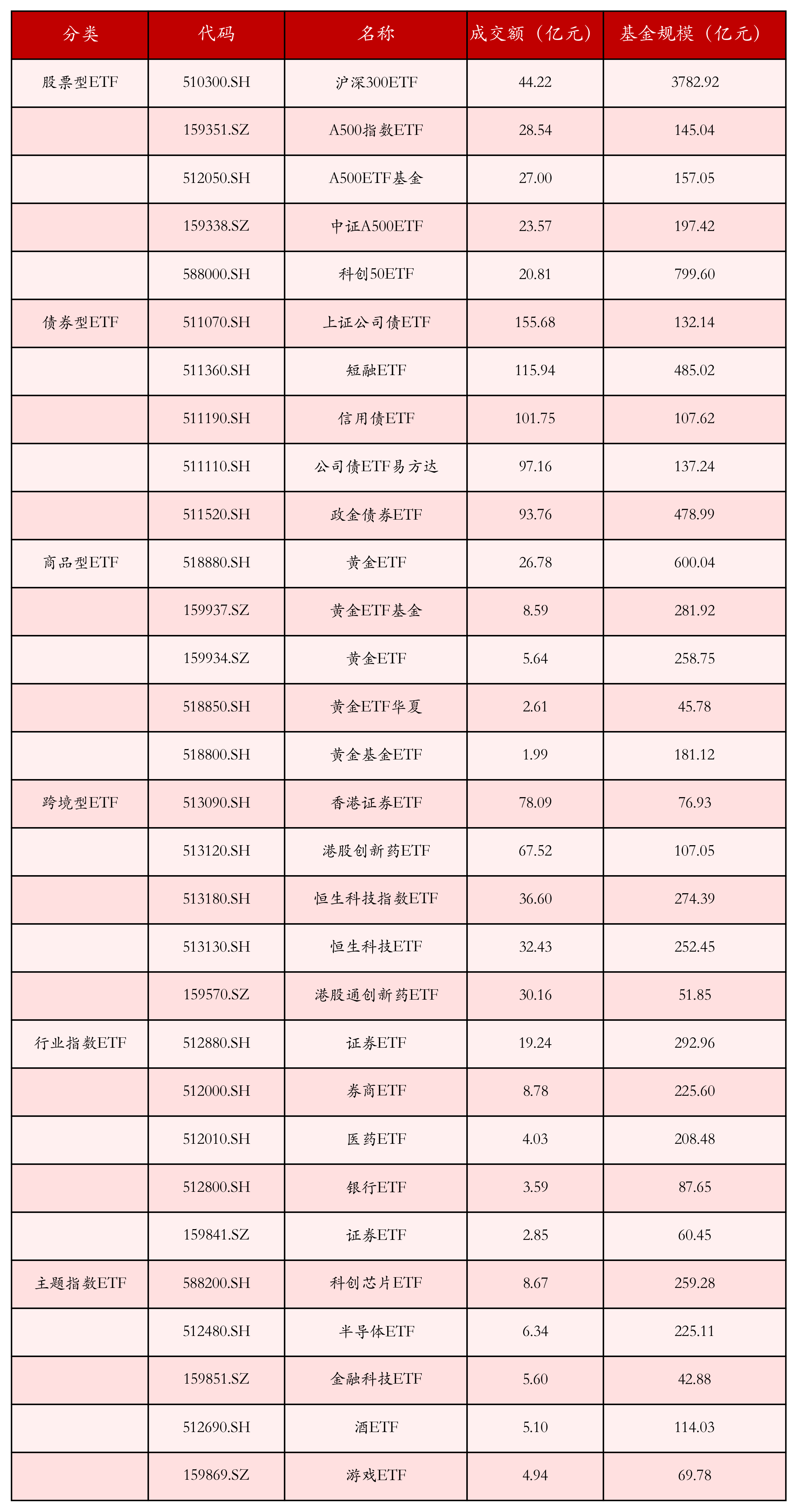 基于成交额对各类ETF今日的成交情况进行统计,成交额靠前的ETF产品如下表所示。股票型ETF中成交额排名前3位的ETF产品分别为沪深300ETF(510300.SH)、A500指数ETF(159351.SZ)和A500ETF基金(512050.SH),今日成交额分别为44.22亿元、28.54亿元和27.00亿元。