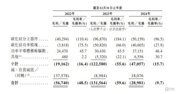 笔者注意到,公司核心产品始终深陷亏损泥潭。报告期内,碳化硅功率模块毛利率为-75.5%、-66%、-27.9%,作为第一大产品始终以亏本状态销售。