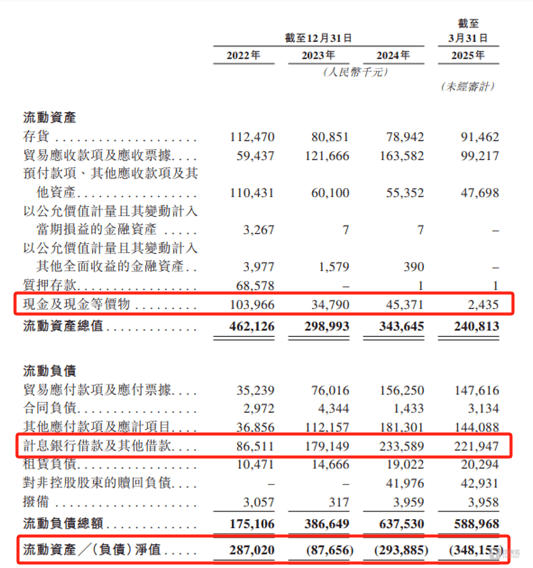 从资产明细上看,在上述时间段内,基本半导体的现金及现金等价物分别为10396.6万元、3479万元、4537.1万元、243.5万元,流动负债中的计息银行借款及其他借款分别为8651.1万元、17914.9万元、23358.9万元、22194.7万元,这也意味着,自2023年起,基本半导体的现金及现金等价物已完全无法覆盖计息银行借款及其他借款所需的资金,现金压力显著,特别是截至2025年3月末,公司现金及等价物仅剩243.5万元,与2.22亿元的计息银行借款及其他借款相比,缺口更是高达2.19亿元。