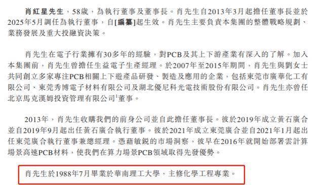 同时,董事长肖红星、总经理曾红同岁,均于同一年毕业于华南理工大学;且肖红星、曾红及总工程师黎钦源三人曾在生益电子任职过。