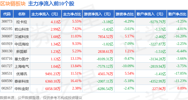 从资金流向上来看,当日区块链板块主力资金净流出35.05亿元,游资资金净流入2.99亿元,散户资金净流入32.06亿元。区块链板块个股资金流向见下表: