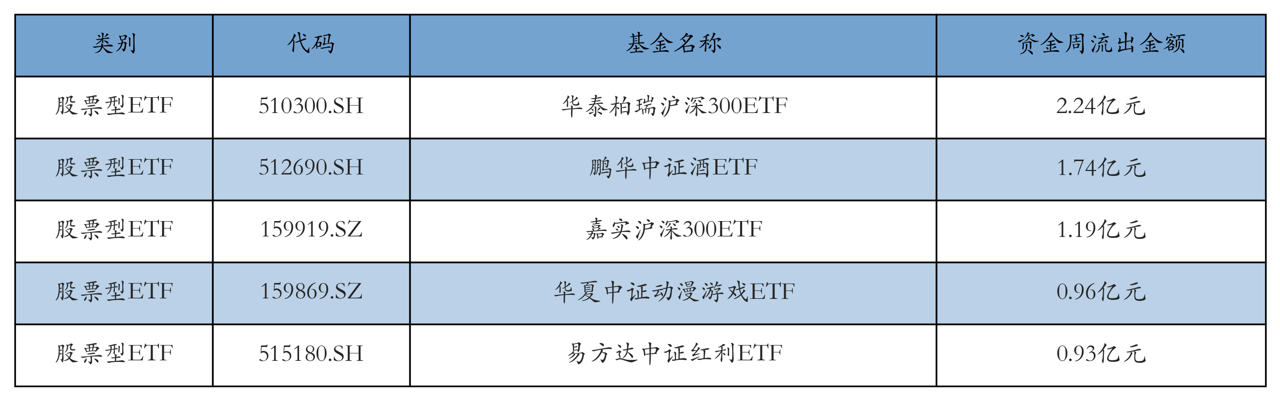上周股票型ETF资金流出最多的5只ETF及其流出金额分别为:华泰柏瑞沪深300ETF(流出2.24亿元)、鹏华中证酒ETF(流出1.74亿元)、嘉实沪深300ETF(流出1.19亿元)、华夏中证动漫游戏ETF(流出0.96亿元)、易方达中证红利ETF(流出0.93亿元)。详情见下表: