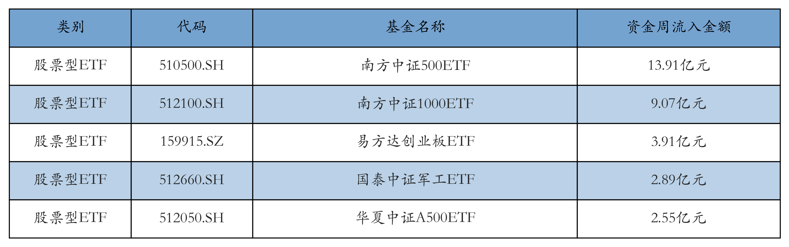 上周股票型ETF资金流入最多的5只ETF及其流入金额分别为:南方中证500ETF(流入13.91亿元)、南方中证1000ETF(流入9.07亿元)、易方达创业板ETF(流入3.91亿元)、国泰中证军工ETF(流入2.89亿元)、华夏中证A500ETF(流入2.55亿元)。详情见下表: