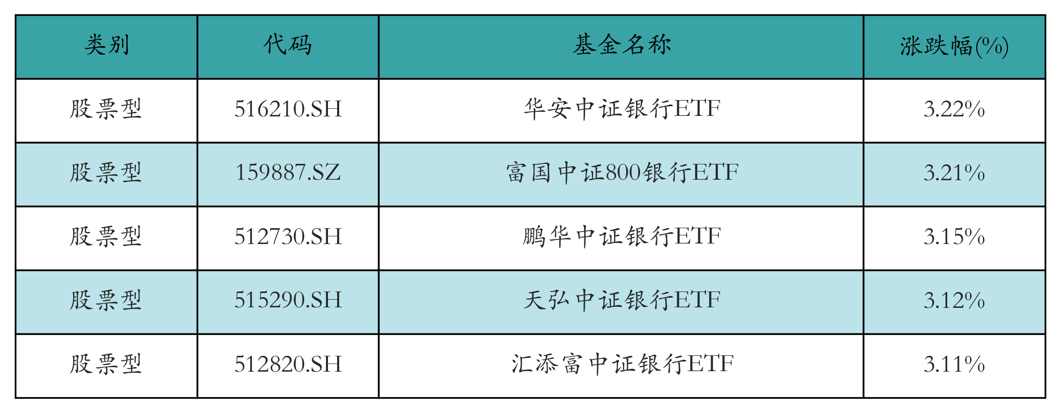 上周股票型ETF涨幅最高的5只ETF及其收益率分别为:华安中证银行ETF(3.22%)、富国中证800银行ETF(3.21%)、鹏华中证银行ETF(3.15%)、天弘中证银行ETF(3.12%)、汇添富中证银行ETF(3.11%)。详情见下表: