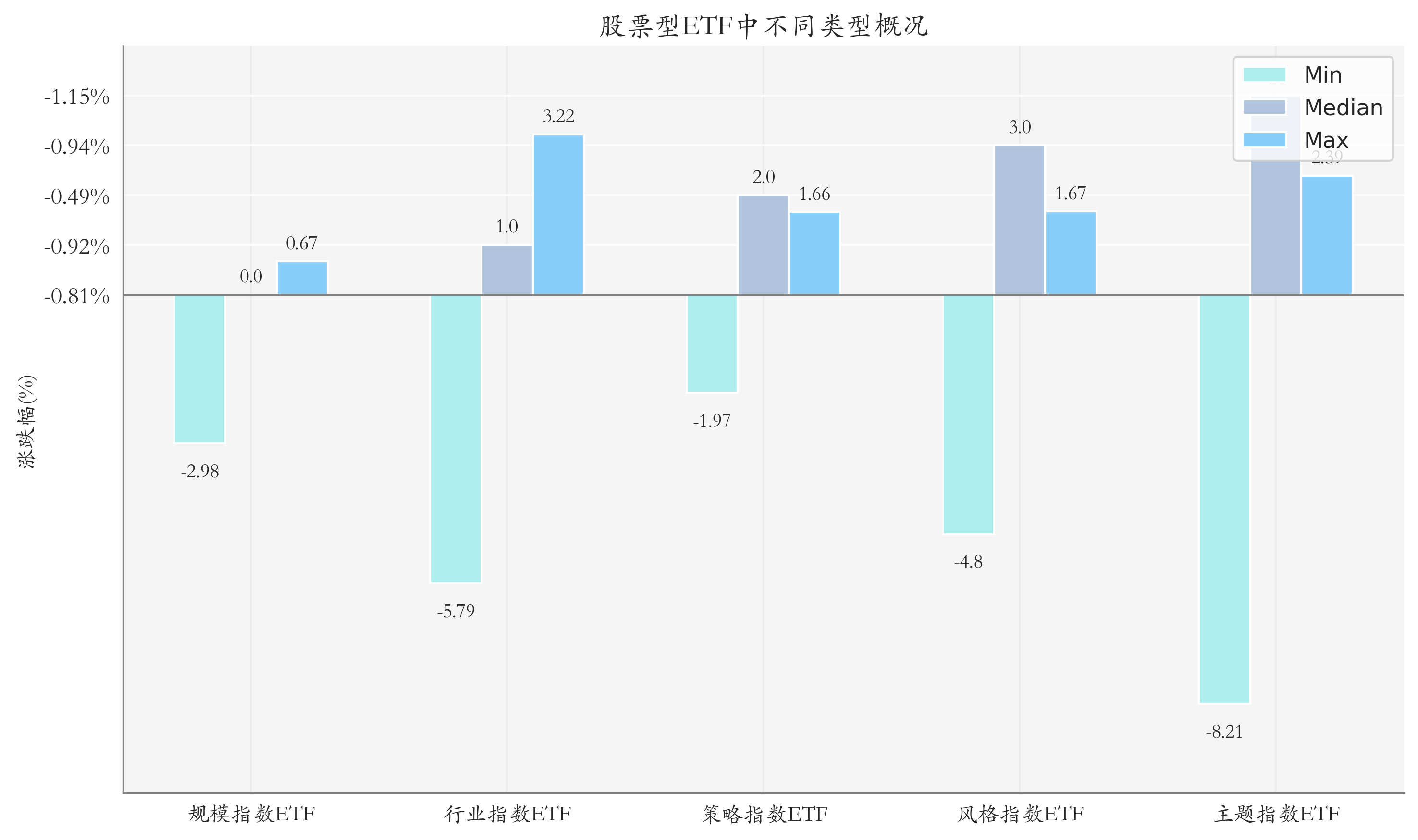 上周股票型ETF周度收益率中位数为-0.91%%。其中按照不同分类,规模指数ETF中易方达上证50增强策略ETF周度收益率最高,为0.67%;行业指数ETF中华安中证银行ETF周度收益率最高,为3.22%;策略指数ETF中新华中证红利低波动ETF周度收益率最高,为1.66%;风格指数ETF中招商中证银行AH价格优选ETF周度收益率最高,为1.67%;主题指数ETF中鹏华中证酒ETF周度收益率最高,为2.39%。