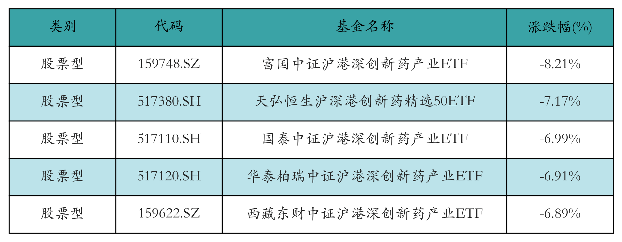 上周股票型ETF跌幅最大的5只ETF及其收益率分别为:富国中证沪港深创新药产业ETF(-8.21%)、天弘恒生沪深港创新药精选50ETF(-7.17%)、国泰中证沪港深创新药产业ETF(-6.99%)、华泰柏瑞中证沪港深创新药产业ETF(-6.91%)、西藏东财中证沪港深创新药产业ETF(-6.89%)。详情见下表: