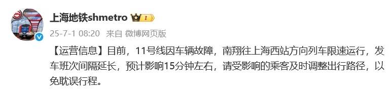 7月1日,上海地铁官博发文:目前,11号线因车辆故障,南翔往上海西站方向列车限速运行,发车班次间隔延长,预计影响15分钟左右,请受影响的乘客及时调整出行路径,以免耽误行程。