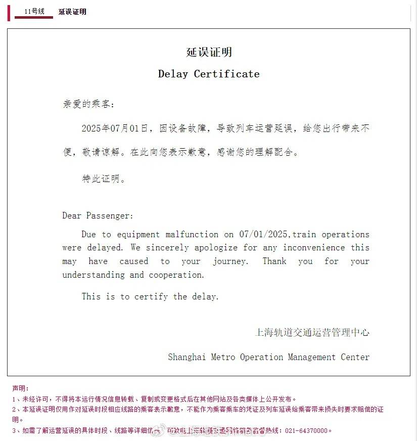 随后,上海地铁官博发布延误证明:“受11号线故障影响的乘客可通过上海地铁官网运营专页获取延误证明。给您出行带来不便,深表歉意!”