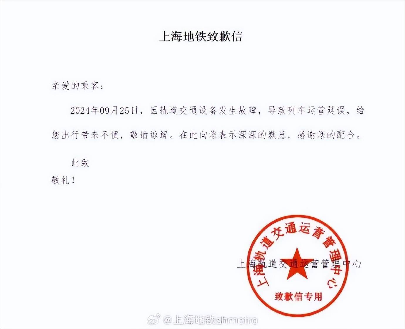 上海地铁官方随即发布致歉信:“受5号线故障影响的乘客可通过上海地铁官网运营专页获取致歉信,给您出行带来不便,深表歉意!”