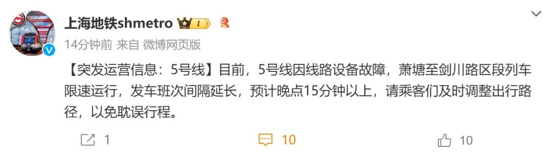 2024年9月25日上午,据上海地铁官方消息:目前,5号线因线路设备故障,萧塘至剑川路区段列车限速运行,发车班次间隔延长,预计晚点15分钟以上,请乘客们及时调整出行路径,以免耽误行程。