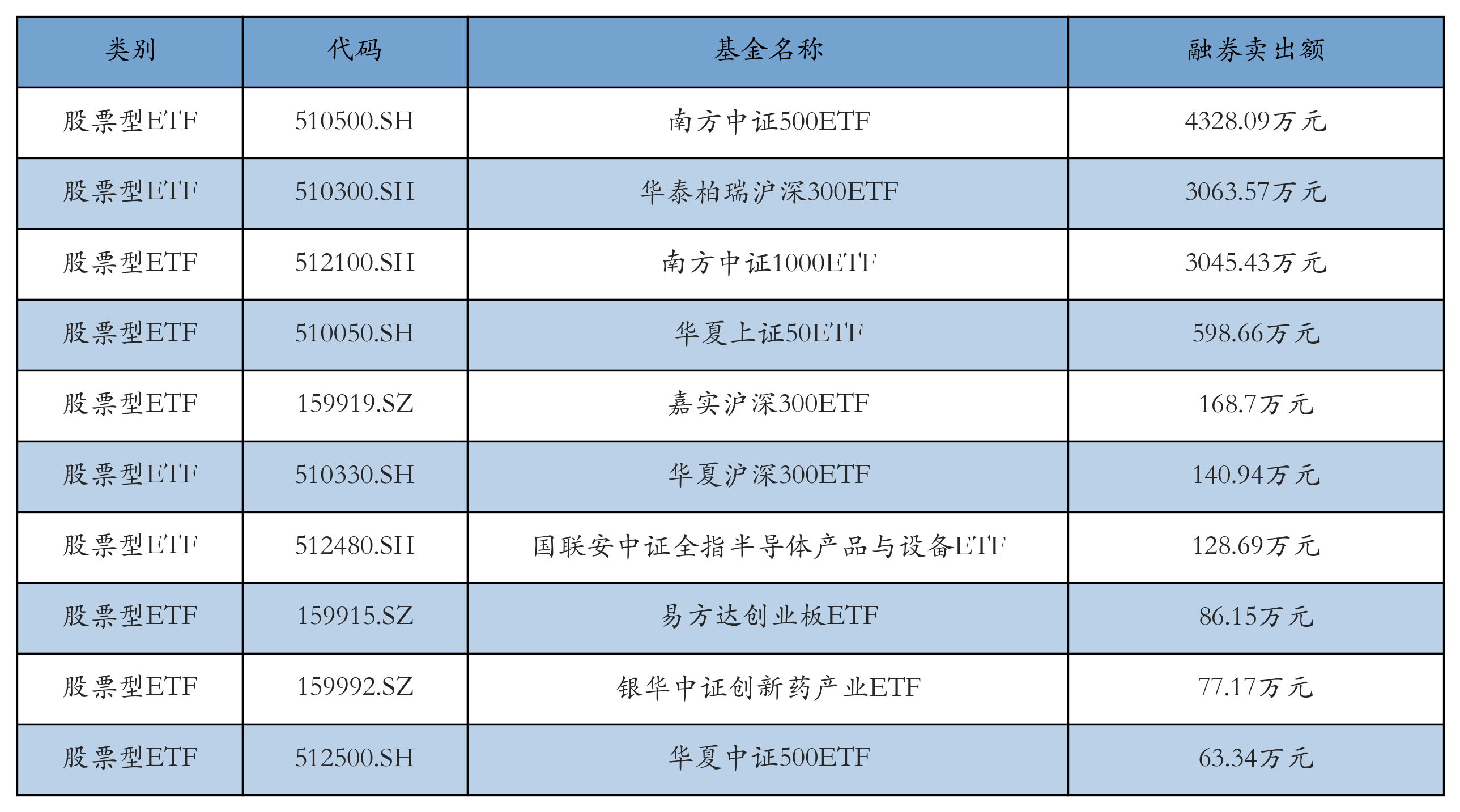 昨日股票型ETF融资卖出额最高的3只ETF及其卖出金额分别为:南方中证500ETF(4328.09万元)、华泰柏瑞沪深300ETF(3063.57万元)、南方中证1000ETF(3045.43万元)。融券卖出额前10详情见下表:
