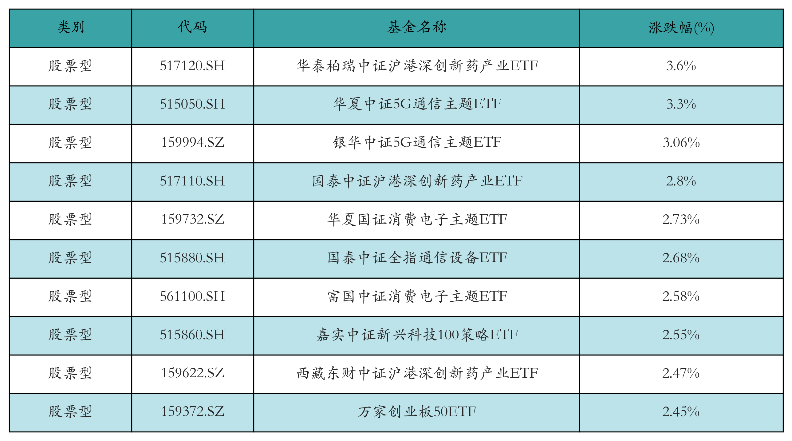 昨日股票型ETF涨幅最高的3只ETF及其收益率分别为:华泰柏瑞中证沪港深创新药产业ETF(3.6%)、华夏中证5G通信主题ETF(3.3%)、银华中证5G通信主题ETF(3.06%)。涨幅前10详情见下表: