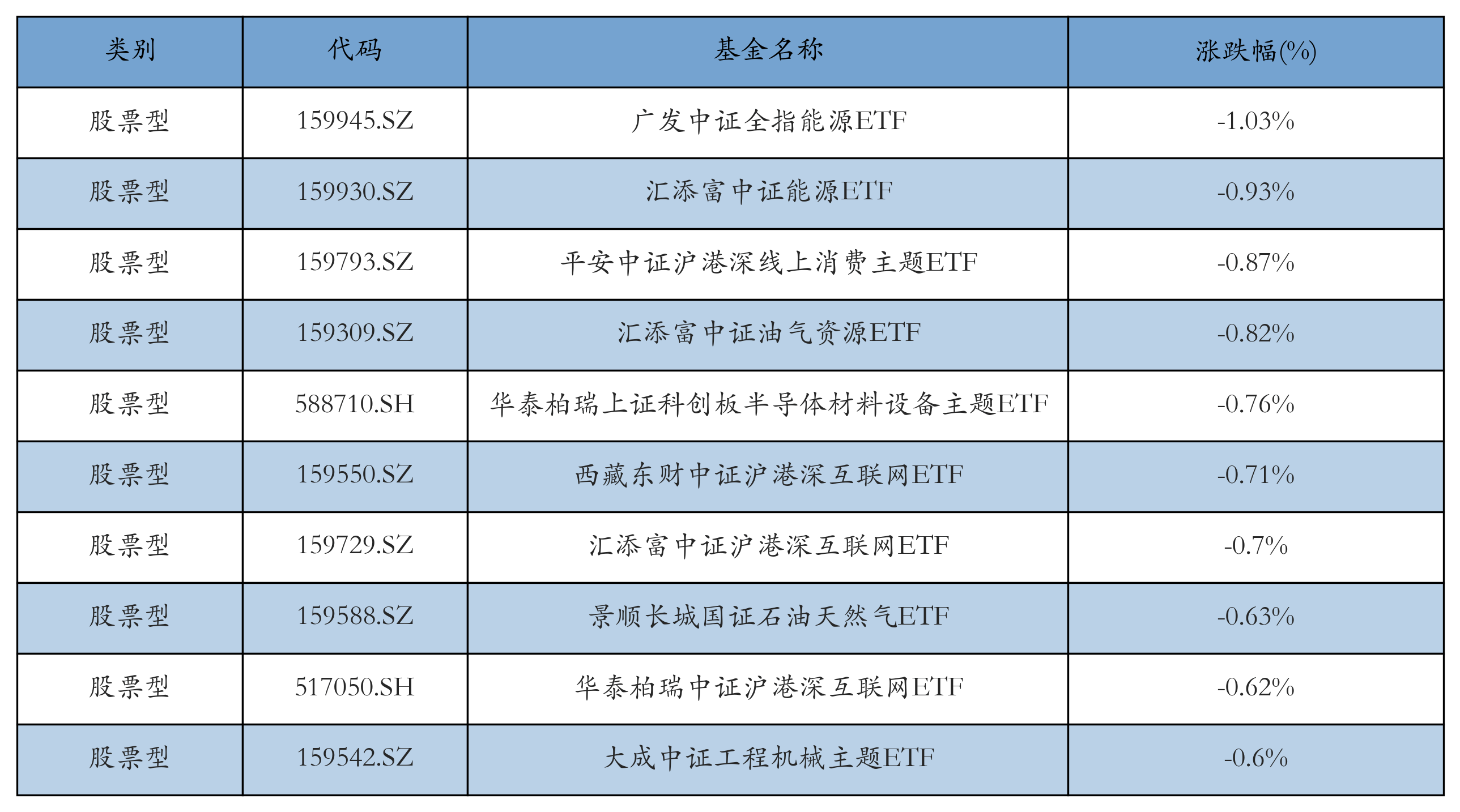 昨日股票型ETF跌幅最大的3只ETF及其收益率分别为:广发中证全指能源ETF(-1.03%)、汇添富中证能源ETF(-0.93%)、平安中证沪港深线上消费主题ETF(-0.87%)。跌幅前10详情见下表: