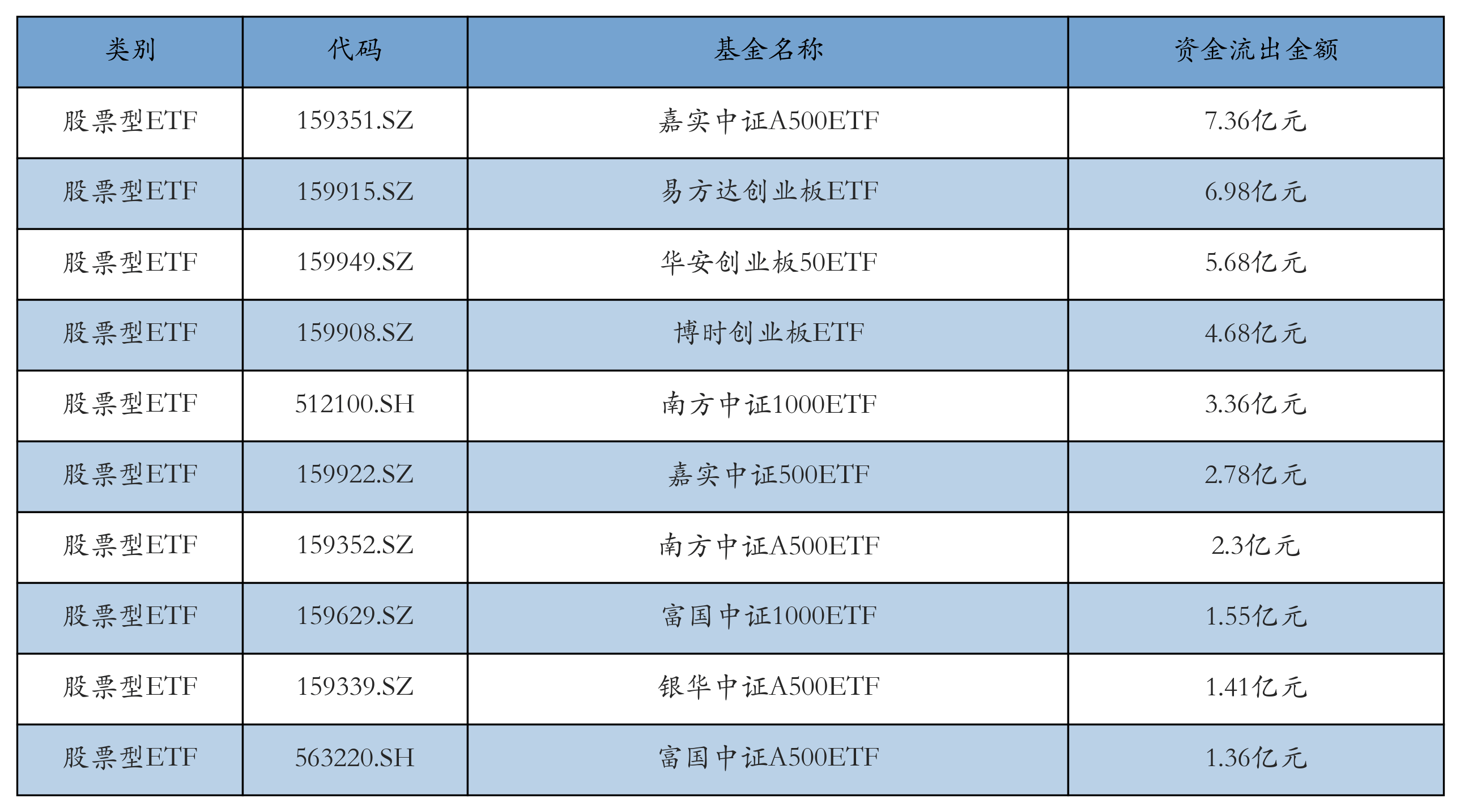 昨日股票型ETF资金流出最多的3只ETF及其流出金额分别为:嘉实中证A500ETF(流出7.36亿元)、易方达创业板ETF(流出6.98亿元)、华安创业板50ETF(流出5.68亿元)。资金流出前10详情见下表: