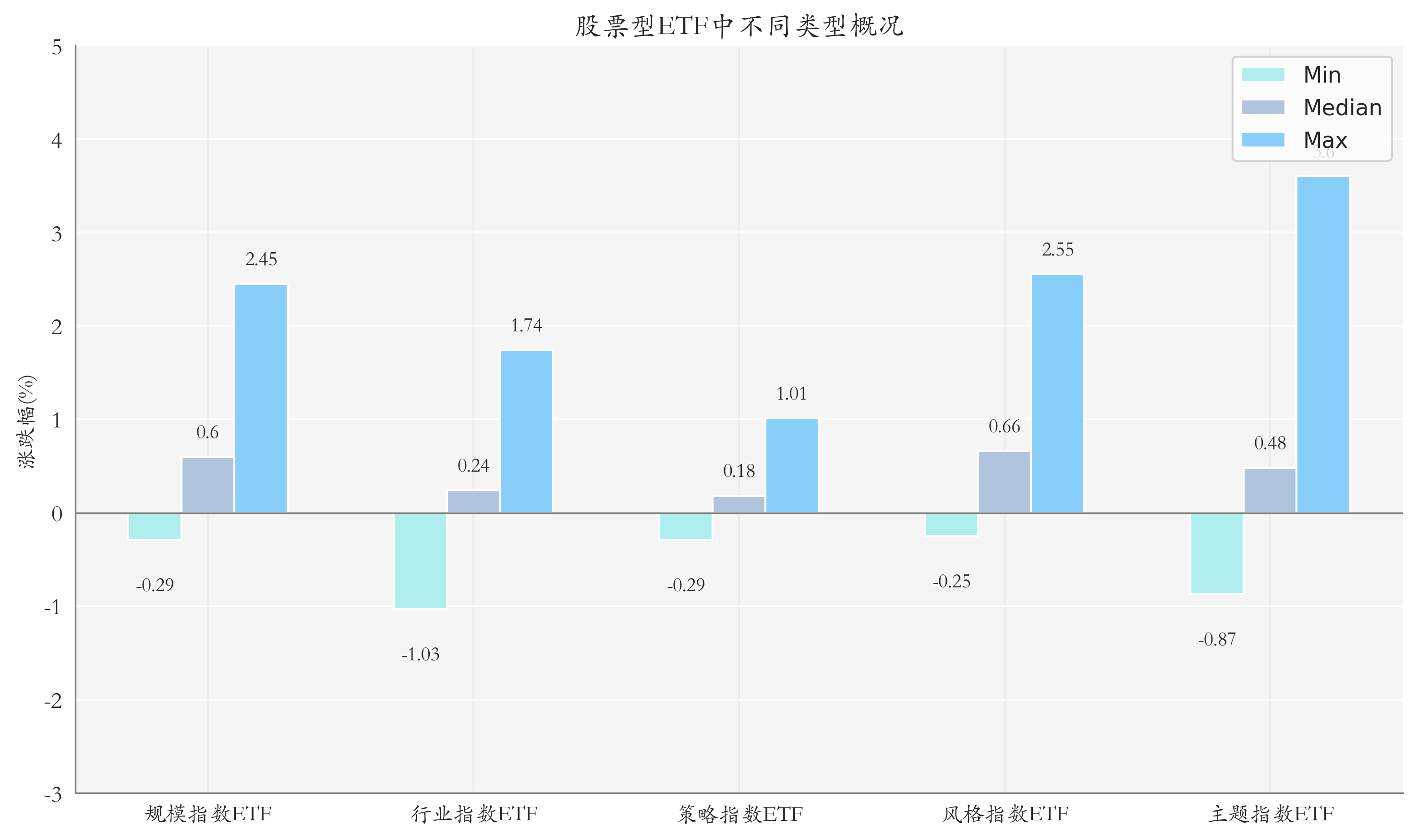 昨日股票型ETF收益率中位数为0.5%。其中按照不同分类,规模指数ETF中万家创业板50ETF收益率最高,为2.45%;行业指数ETF中广发中证全指信息技术ETF收益率最高,为1.74%;策略指数ETF中中金MSCI中国A股国际质量ETF收益率最高,为1.01%;风格指数ETF中嘉实中证新兴科技100策略ETF收益率最高,为2.55%;主题指数ETF中华泰柏瑞中证沪港深创新药产业ETF收益率最高,为3.6%。