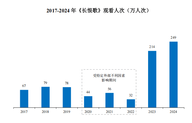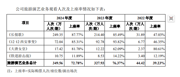 在外部游客数量没有特别高增长的情况下(2024年西安游客量仅比2019年增长2%),长恨歌实现了观看人次的高速增长,2024年上座率接近90%。