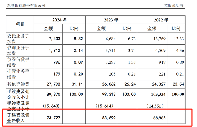 招股书显示,东莞银行的手续费及佣金净收入近年来呈现下降的情况,2024年末,手续费及佣金净收入为7.37亿元,较2023年同期下降近1亿元,下降幅度达11.95%。