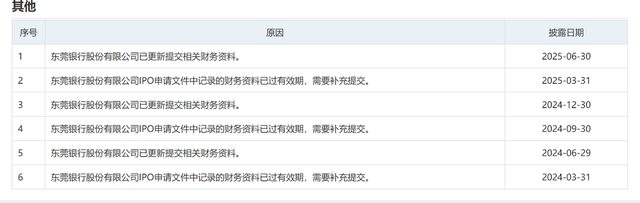 在2025年3月份,东莞银行因财务资料过期而被迫中止后,东莞银行于6月30日更新材料,更新招股书。