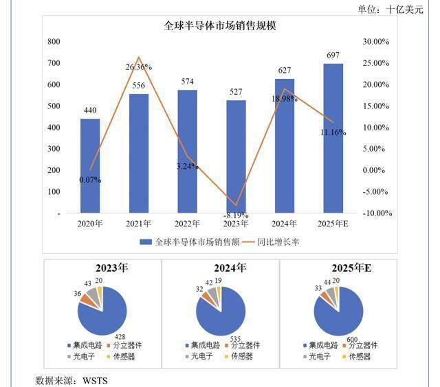 据WSTS数据,2024年全球集成电路、分立器件、光电子和传感器市场规模分别为5345亿美元、316亿美元、421亿美元和187亿美元,在全球半导体行业占比分别为85.26%、5.04%、6.72%和2.98%,预计2025年将增长至6972亿美元。